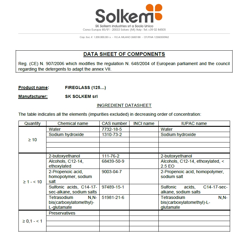 Složení v souladu s Nařízením č. 648/2004: Méně než 5% Aniontové povrchově aktivní látky, Neiontové povrchově aktivní látky. Konzervanty: 1,2-benzisotiazol-3(2H)-one