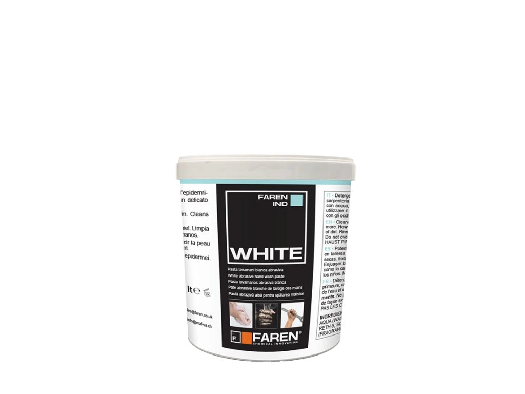 WHITE je bílá krémová mycí pasta na ruce s abrazivem.